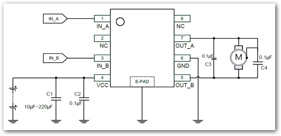 AM1025EA 的低馬達驅動內阻特性,可以應用在連續 2.3A 以下電流的馬達電機上。