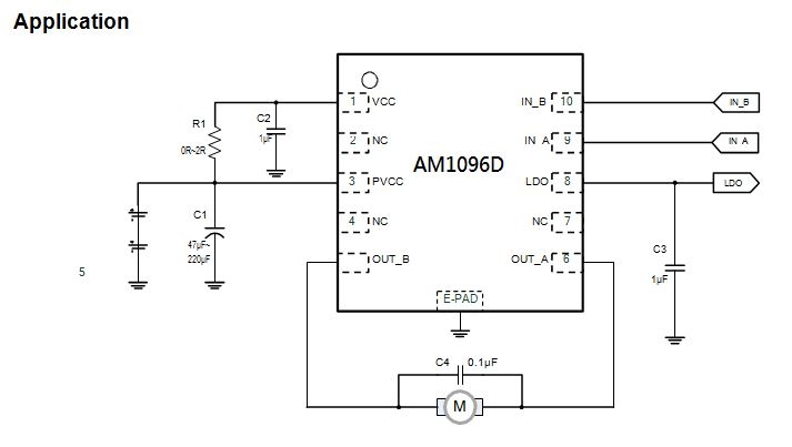 The AM1096D is a channel H-Bridge driver with a build in Low Dropout Regulator (LDO). It provides integrated motor-driver solution for high current power motion control applications. The output driver block consists of N-channel and P-channel power MOSFETs configured as H-Bridge to driver DC motor.